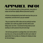 these shirts are 100% designed and hand-pressed by me in my home studio onto black 100% cotton unisex gildan heavy cotton t-shirts
