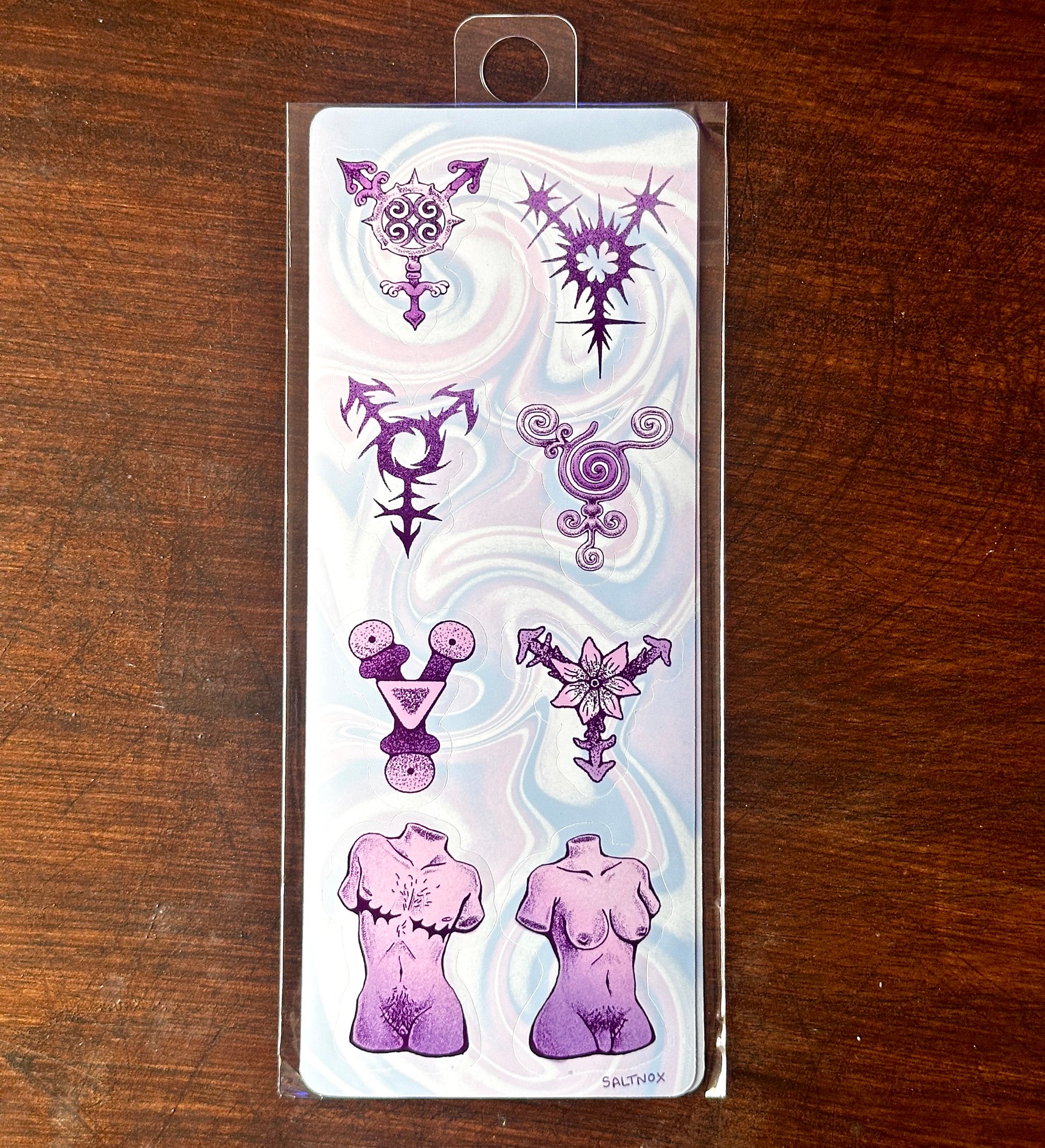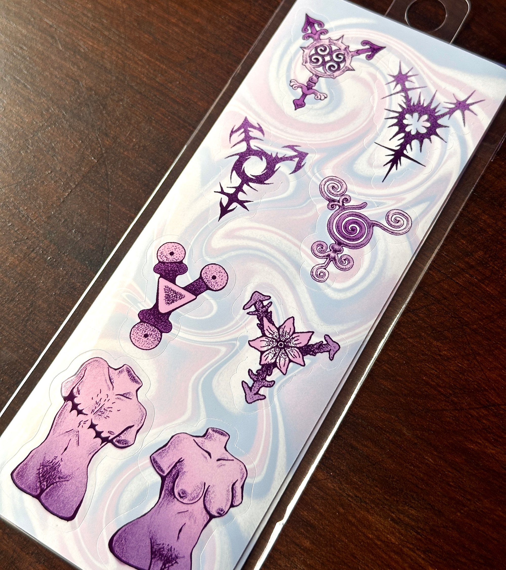 these sticker sheets are homemade and printed on glossy vinyl sticker paper, each sticker sheet is approximately 2.75x7" and are made with lots of love :)
